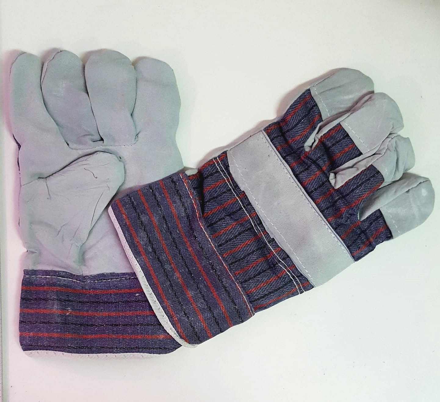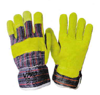 Cowsplit leather joint-palm and wing thumb, green colour cowsplit leather re-inforcement on palm, index-finger and thumb, striped cotton back, rubberized cuff, palm lined.