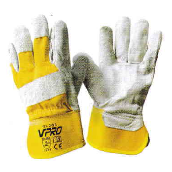 Cowsplit leather palm and wing thumb, natural white cotton back, PE cuff, palm lined.